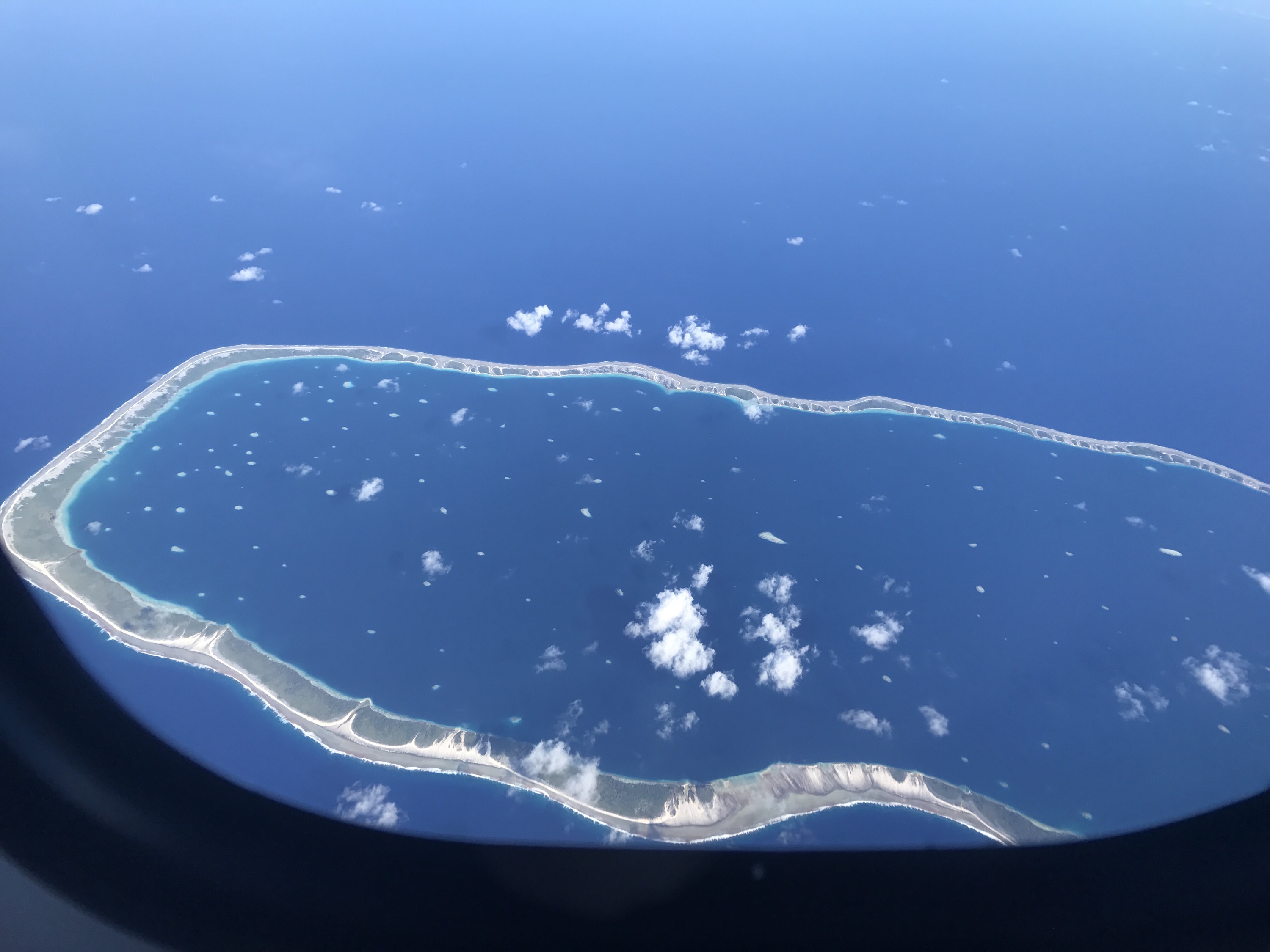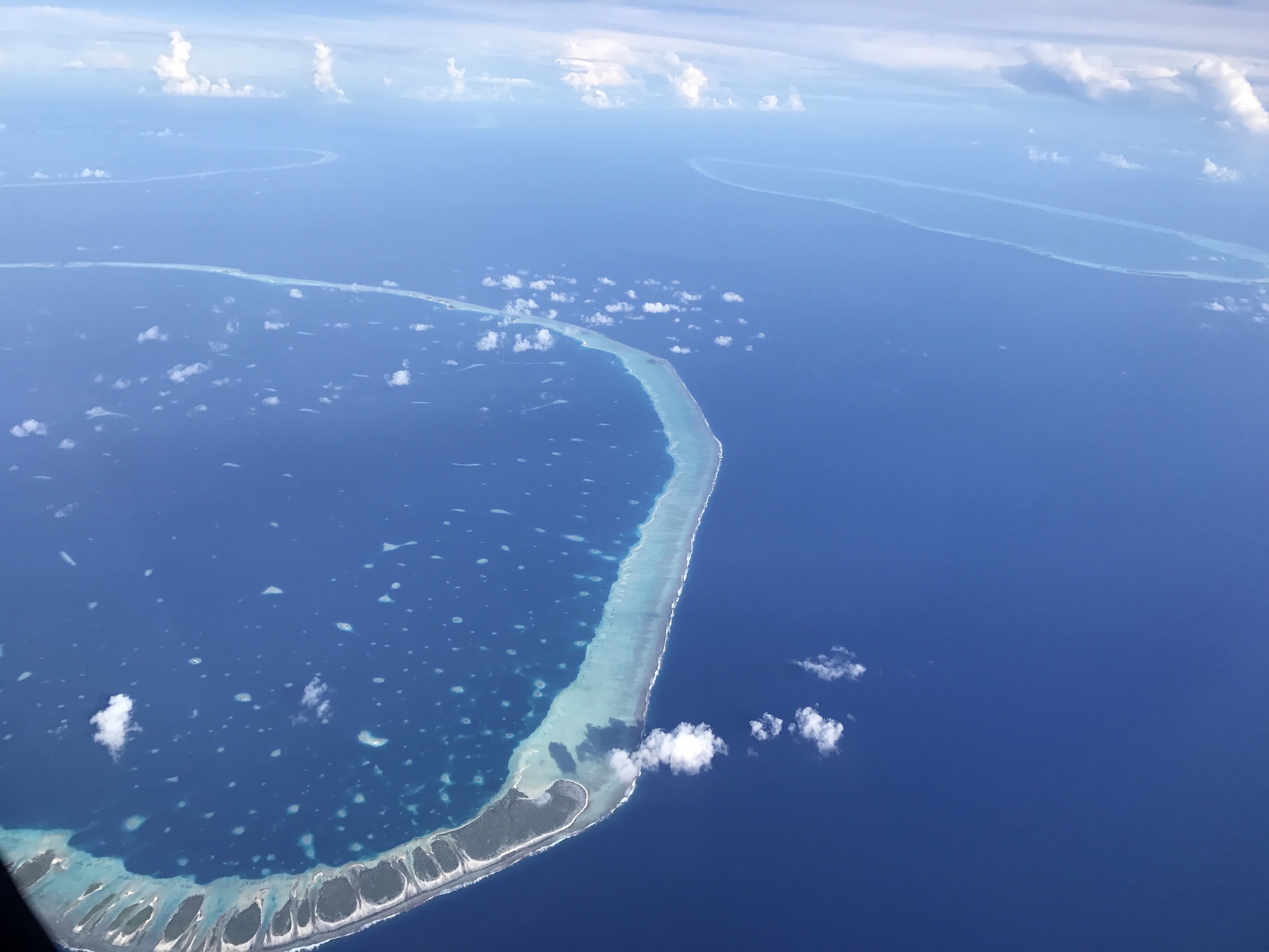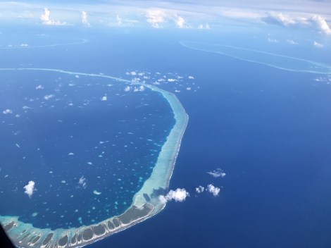 Een goed bewaard geheim: 77 atols – ovale ringen van koraal met daarbinnen turquose lagoons- tussen de Marquesas en de Cook eilanden . We hebben ze gezien tijdens onze vlucht naar Tahiti. Heel bijzonder. Op sommige atols wonen mensen en is het toerisme gestaag aan het groeien, niet verwonderlijk! Enkele atols hebben een opening en kun je naar binnen varen.
